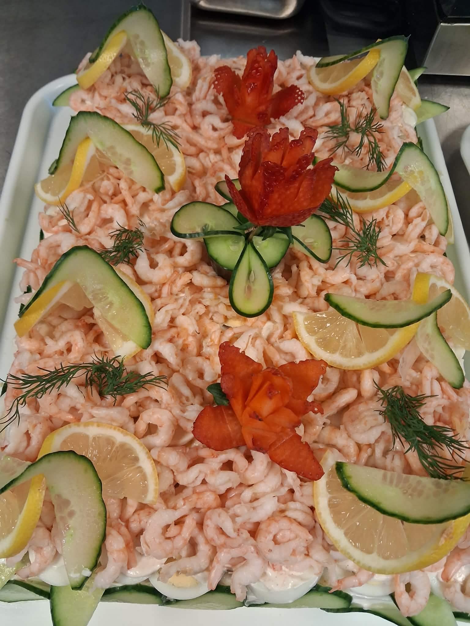 Havets smörgåstårta har två olika fyllningar, den ena med tonfiskröra och den andra med en rökt laxröra. Toppen på smörgåstårtan garneras med handskalade räkor, ägg, citronskivor, gurka, dill